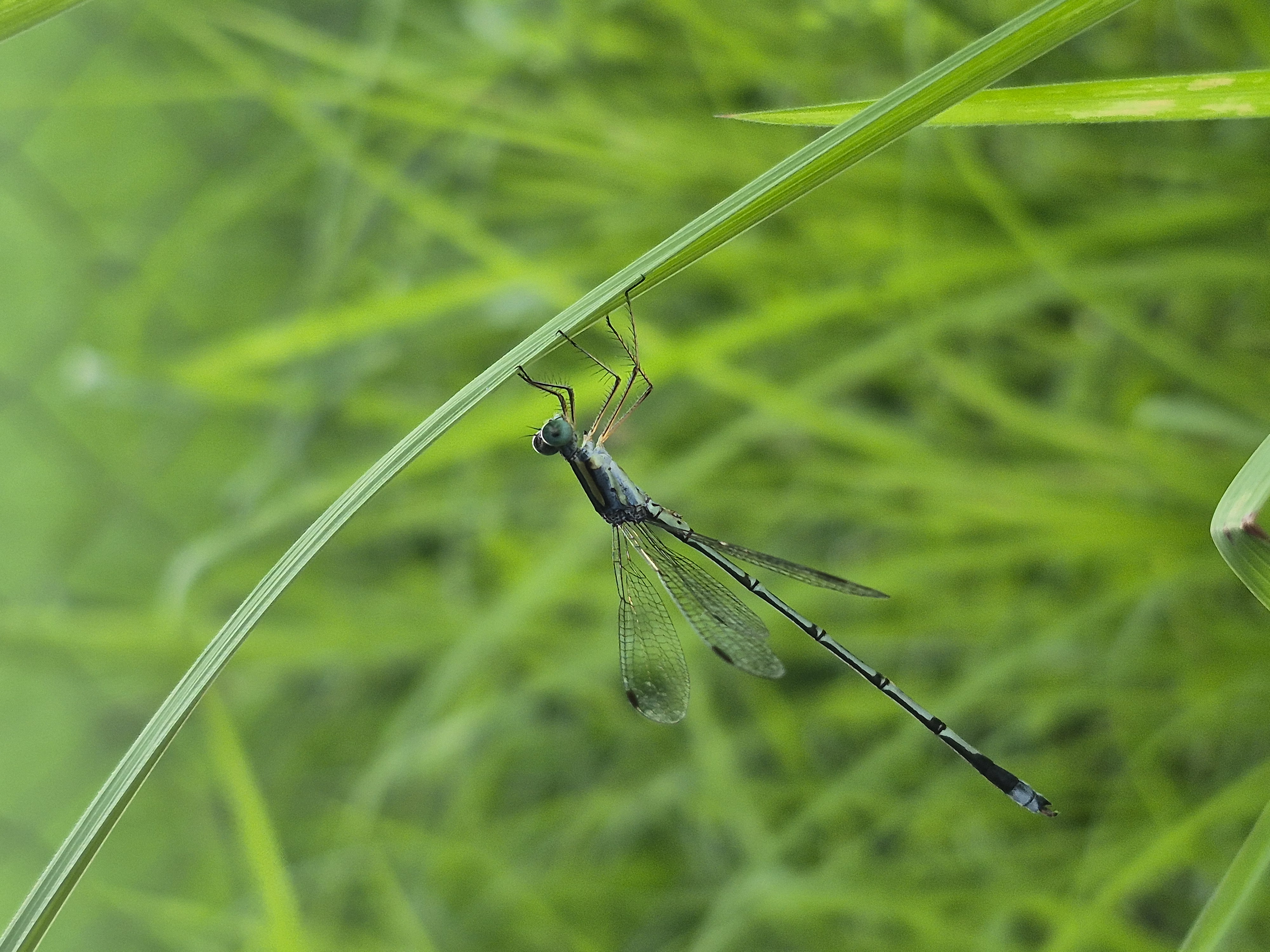 Distinctive Features: Lestes nigriceps is a visually striking damselfly. It is characterized by its glittering emerald stripes on the thorax and piercing turquoise-blue eyes. Like other "spreadwings," it has a unique resting posture, holding its wings partially open, unlike most other damselflies that fold their wings completely against their bodies.